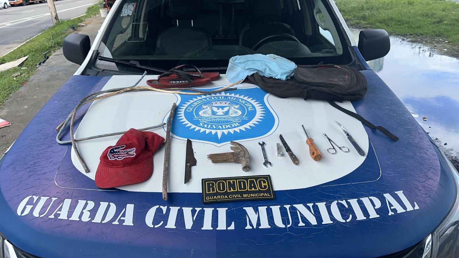 No início da manhã, a equipe foi acionada para uma ocorrência na 1ª Avenida do Centro Administrativo da Bahia, onde avistou um indivíduo escavando o solo em uma tentativa de retirar fiação subterrânea. Durante a abordagem, foram encontradas diversas ferramentas, como picaretas, facas e serrotes, que indicavam a intenção de furto. O suspeito, que já possuía várias passagens por unidades policiais, não havia conseguido acessar a fiação. O material foi apreendido e ele foi liberado no local por falta de materialidade.